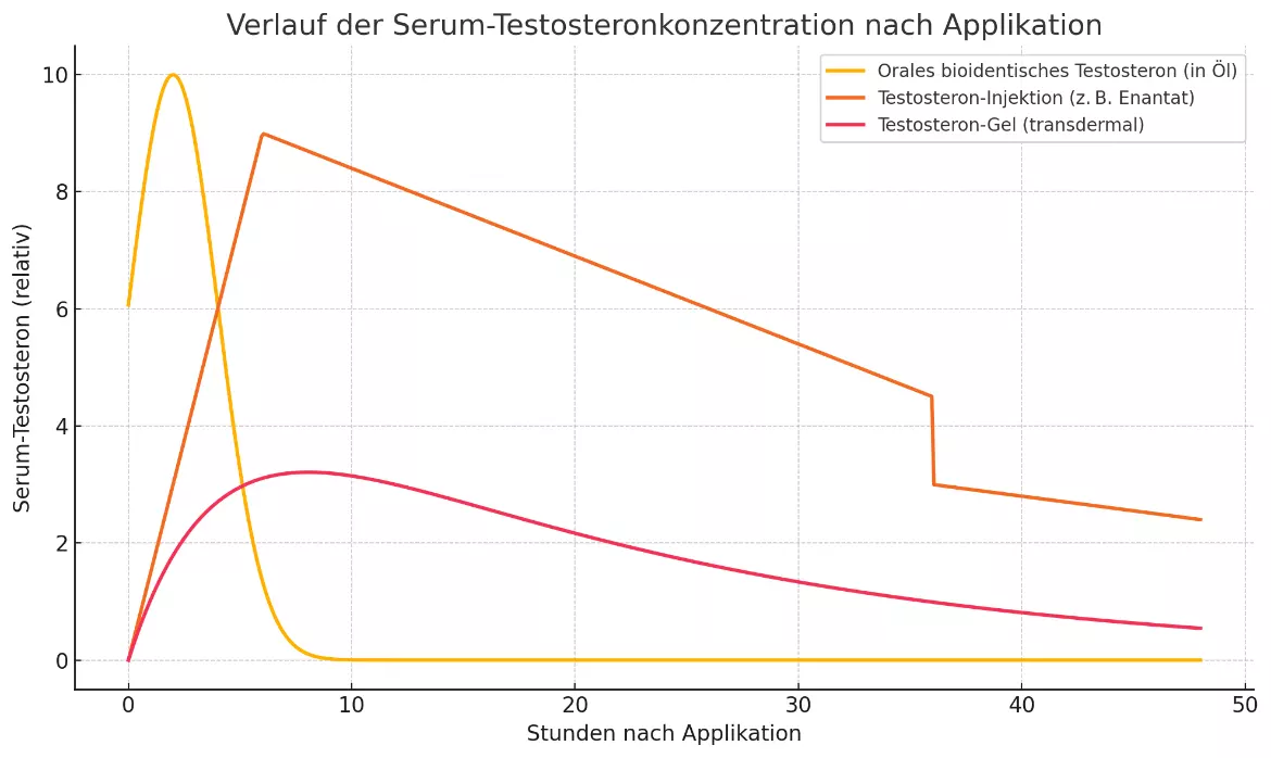 Jede Applikationsform hat spezifische Eigenschaften. Während Injektionen über lange Wirkdauer und hohe Maximalspiegel verfügen, erlaubt das orale bioidentische Testosteron eine schnelle, steuerbare und individuell dosierbare Wirkung – mit objektiv messbarem Spiegelanstieg nach wenigen Stunden. Transdermale Gele bieten eine kontinuierliche Spiegelanhebung, erreichen jedoch nur begrenzt höhere Konzentrationen.